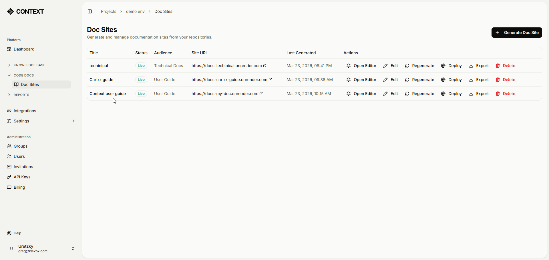 Point Klevox at your repo. In minutes, get a full documentation site — not an API dump, but real docs with architecture overviews, module guides, and getting-started pages. Supports TypeScript, JavaScript, Python, Go, Java, Rust, and more.